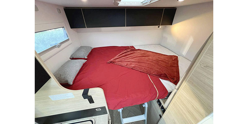 L’espace nuit à l’arrière : la zone couchage (lit transversal) avec la salle d’eau , séparée du salon pour plus d’intimité. Un lit deux places permanent. Sous le lit, retrouvez de nombreux rangements astucieux et pratiques : penderie, placard et accès au coffre arrière. Le lit est facile à lever, car c’est un lit « papillon ».