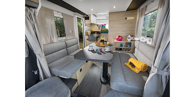 L’espace jour à l’avant : le salon / coin repas avec la cuisine à proximité, pour la vie à bord en journée. Un salon face à face qui se transforme en 2 sièges face route avec fixations isofix lors de vos trajets. La cuisine est équipée avec plaques gaz, frigo trimixte et évier. Vous tiendrez aisement à 4 autour de la table, en plus des 2 banquettes, les 2 sièges avant pivotent pour compléter l’espace repas.